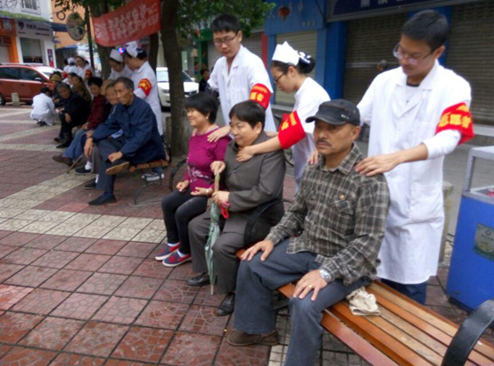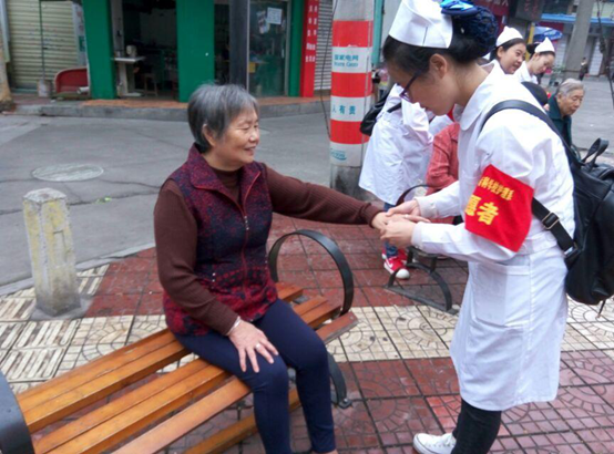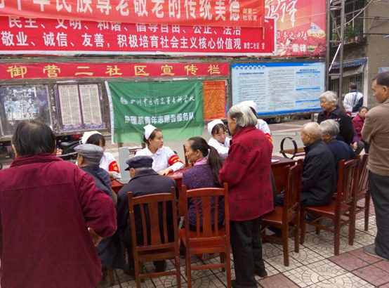绵阳市御营二社区住着许多退休的老人,他们的子女大多都在外地打工。这些“空巢老人”非常需要精神方面的关怀,其中一些身患疾病的老人更加需要医护方面的关心和帮助,护理系的志愿者们到此献爱心,服务老人,给他们带来快乐。