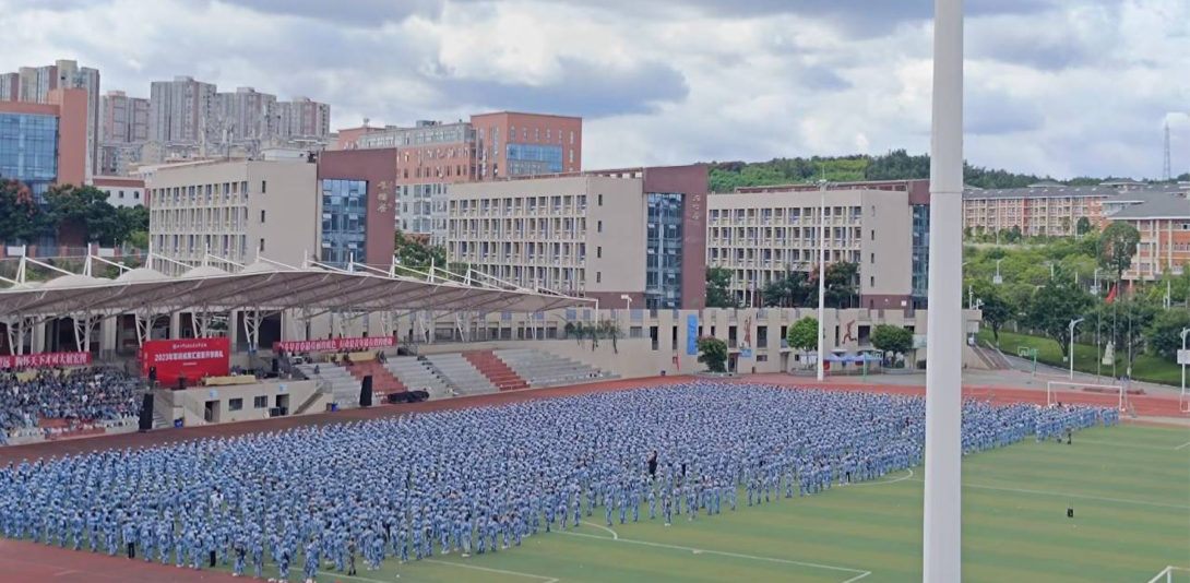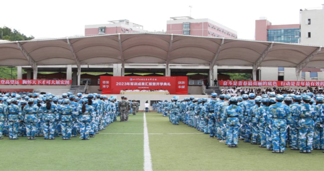 秋风飒爽,丹桂飘香。四川中医药高等专科学校于2023年9月10日下午两点三十分在南区足球场召开2022级、2023级新生开学典礼暨军训开训仪式。本次仪式由校党委副书记汪涌泉主持、副校长梁晓峰、各职能部门、各学院负责人参加,涪城区人民武装部政委余江到场指导。开训仪式在升国旗、奏唱国歌仪式中拉开序幕,同时也拉开了医专学子们的军训生活。