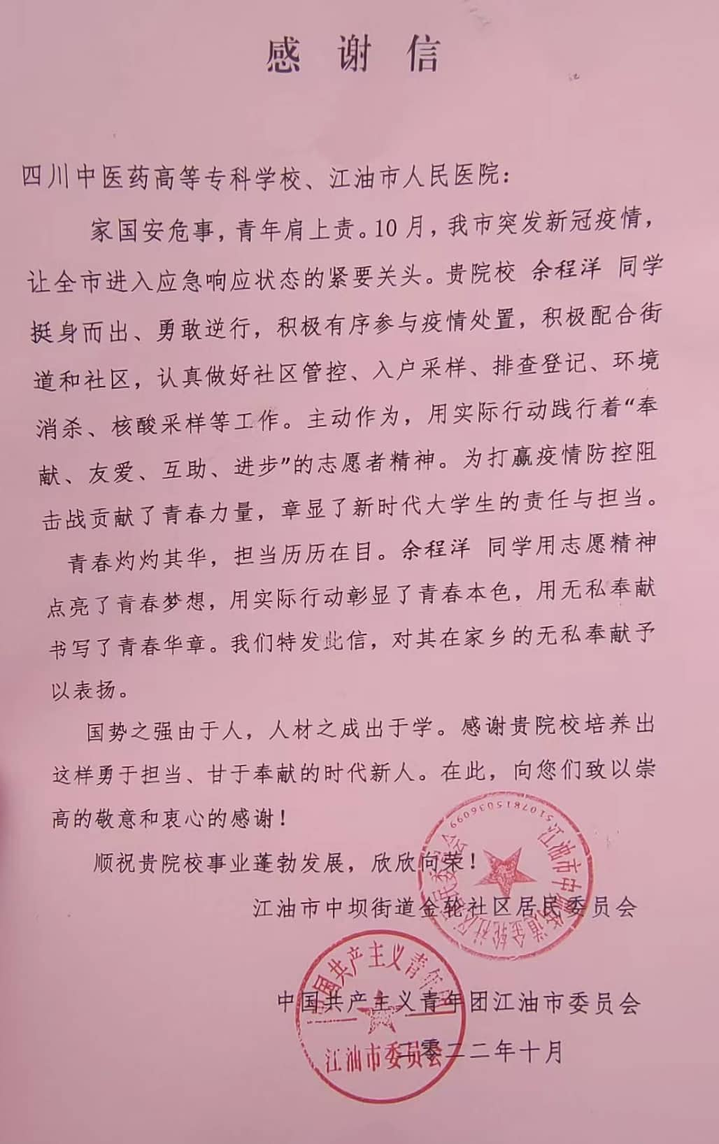 10月9日,江油市中坝街道金轮社区居民委员会 中国共产主义青年团江油市委员会联合向学校发来感谢信,表扬我校2018级高职护理4班余程洋同学,在9月30日至10月9日,江油市突发新冠疫情,全市进入应急响应状态的紧要关头,积极向当地团组织报到,就地化身志愿者,充分发挥所学专业优势,协助街道和社区,积极开展人员排查登记、环境消杀、核酸采样等工作。主动作为,服务家乡。用实际的行动践行“奉献、友爱、互助、进步”的志愿者精神,用坚定的态度彰显新时代大学生的责任与担当。