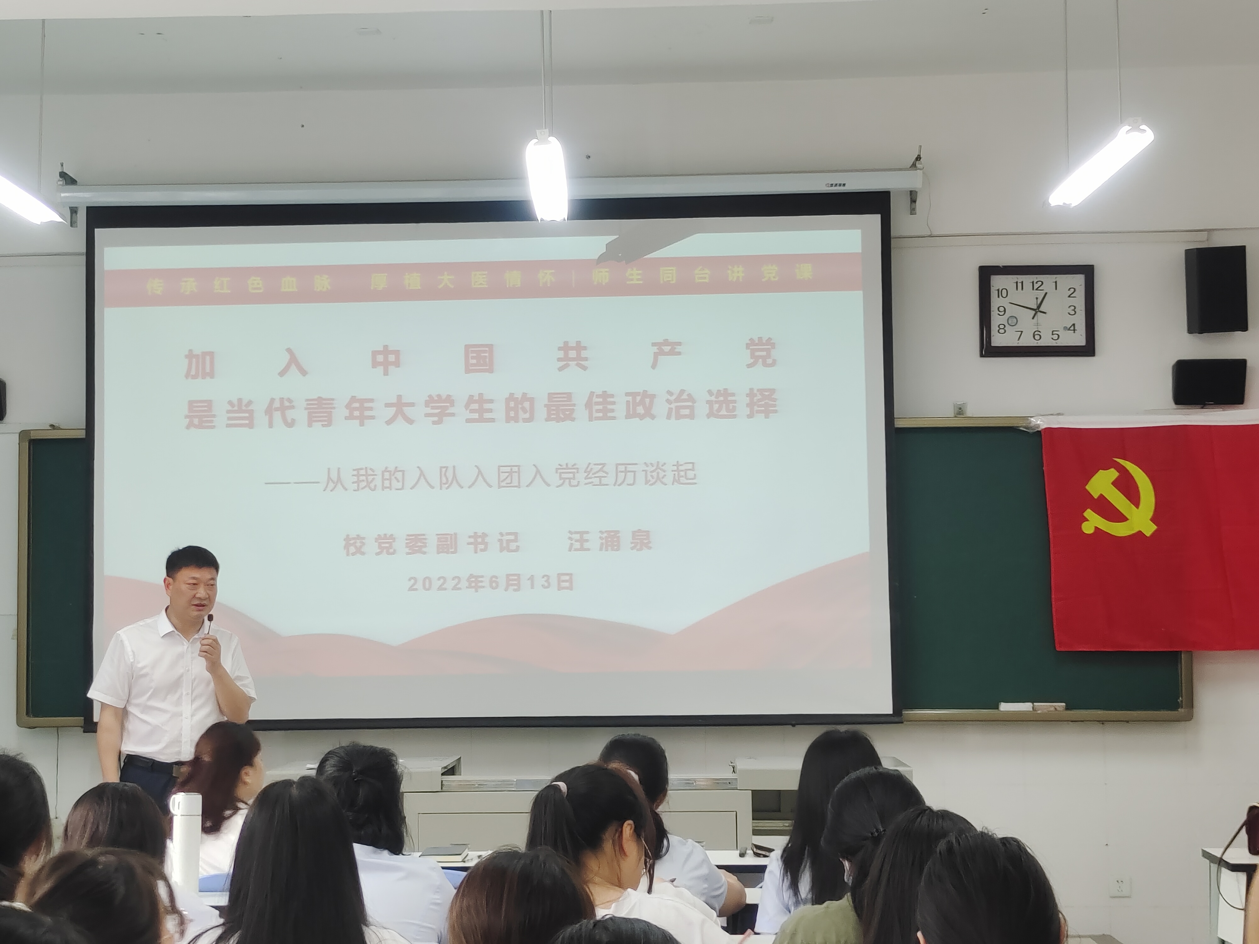 6月13日,护理学院党总支开展“坚守初心育人才,一心向党担大任”主题党日活动,学院全体党员教师、入党积极分子代表、团学干部等50余人参加党课学习;校党委副书记汪涌泉与师生同台讲党课。