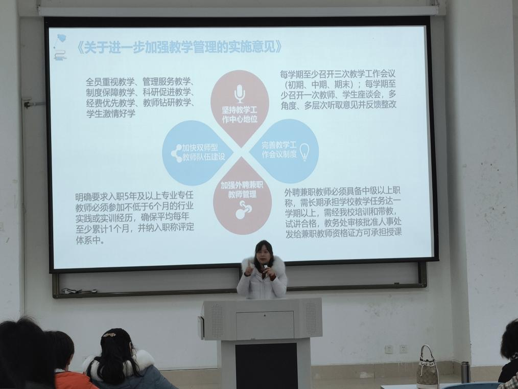 就学校加强教学管理方面,何海艳副院长从坚持教学工作地位、完善教学工作会议制度、加快双师型教师队伍建设和加强外聘兼职教师管理等方面提出了实施意见,强调了全员需重视教学、管理服务教学、制度保障教学、科研促进教学、经费优先教学以及教师钻研教学等,同时提及调课管理规定文件领学,有利于维护正常的课堂教学秩序,规范了教师调课程序,全面提高教学质量。
