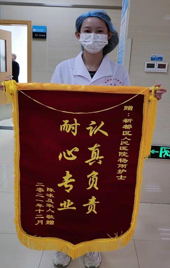 小杨说:“锦旗是对实习期的我一种肯定也是对我的鼓励,更是对我的鞭策,我会继续努力,不忘初心,弘扬南丁格尔精神,认真对待每一位患者。在今后的工作中,也会了解每一位患者的基础病情,细心注意患者的情绪变化,放慢语速告知患者注意事项,缓解患者紧张情绪。对待没有家属陪同的患者,积极询问有没有需要帮助的地方。细心操作、不推卸责任、不寻找借口,尽全力做好工作。