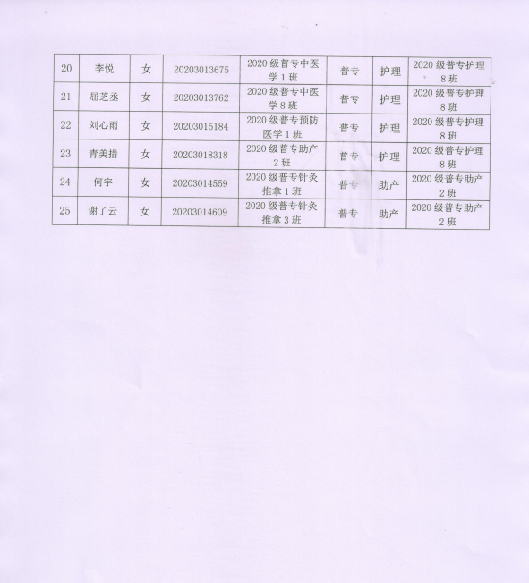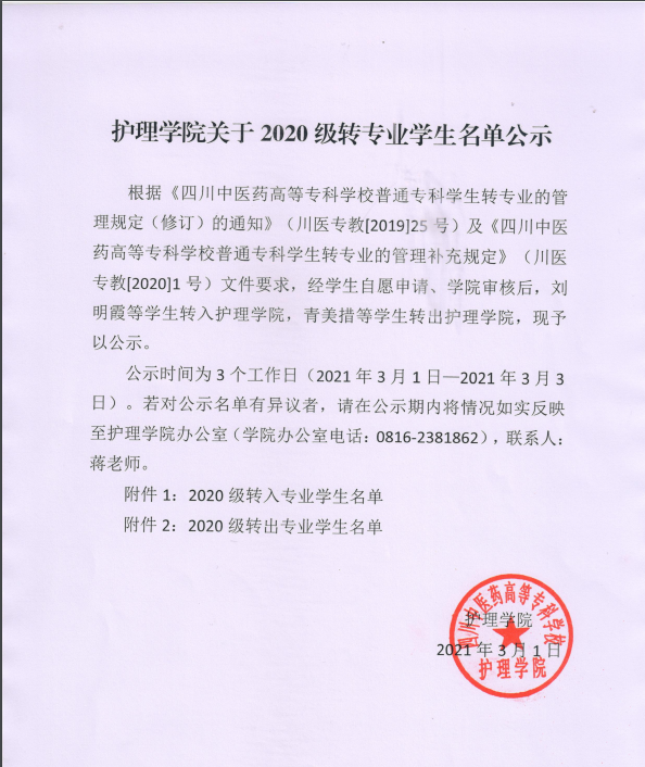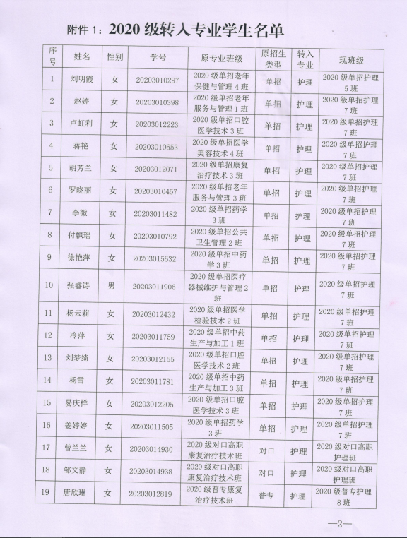 2020级转专业名单公示