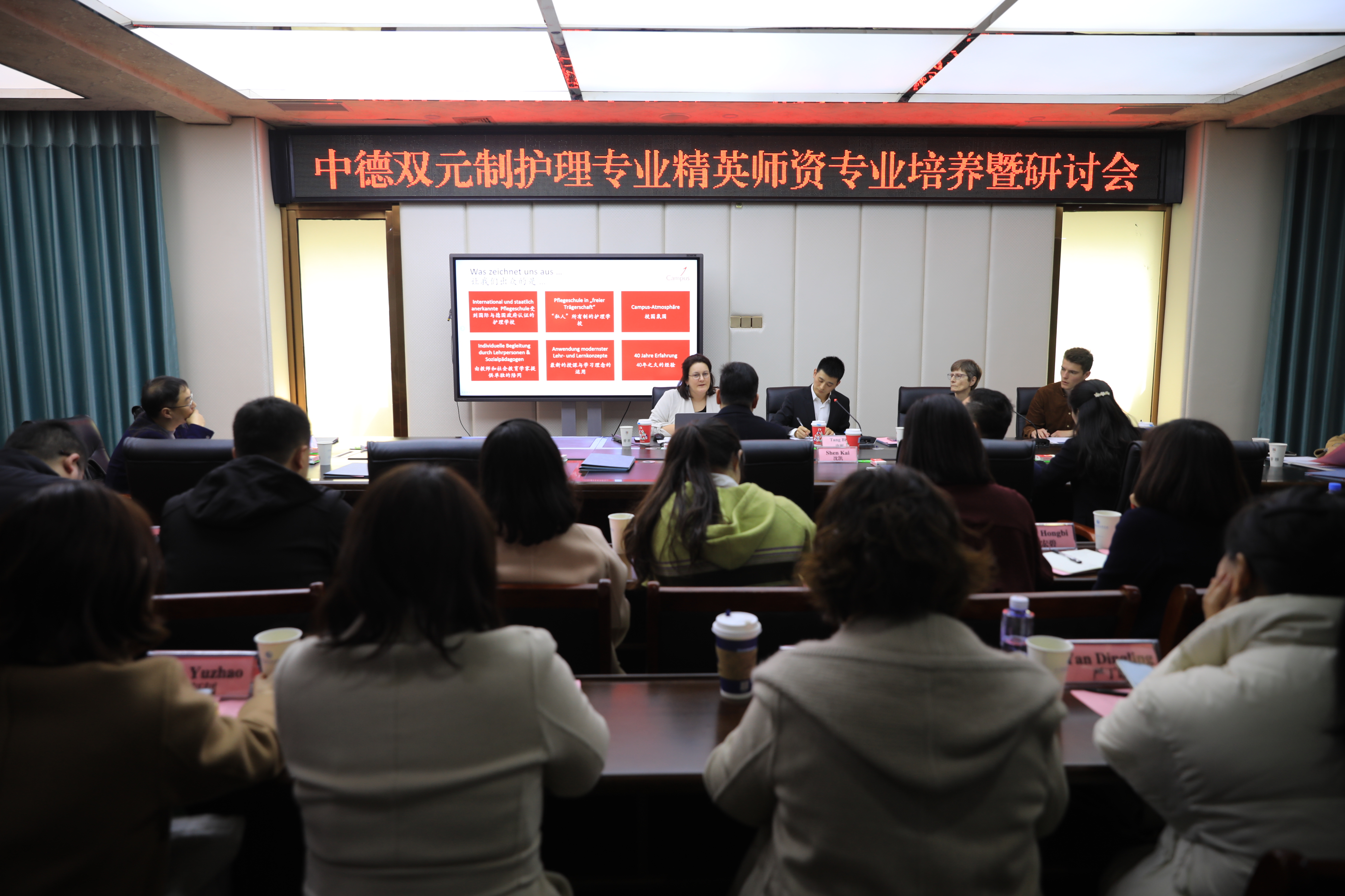 游瑟芬·郝若女士对德国双元制护理教育模式、教学理念、师资培养等方面进行了介绍,并就德国护士职业培训、职业发展、教学方法与理念、学生交流互访等方面进行与我校相关人员进行深入探讨。据悉,德国BBZ双元制护理学校隶属于德国领先的职业教育专业机构——德国BBZ MITTE教育及科技中心,该中心所有课程、管理及研发均通过DIN EN ISO 9001:2015质量认证,并提供包括职业教育的学历教育、专业技术人才赴德国就业、职业资格教育、在职培训、再就业培训、双元制本土化“德国国际班”等多元化的国际职业教育合作。