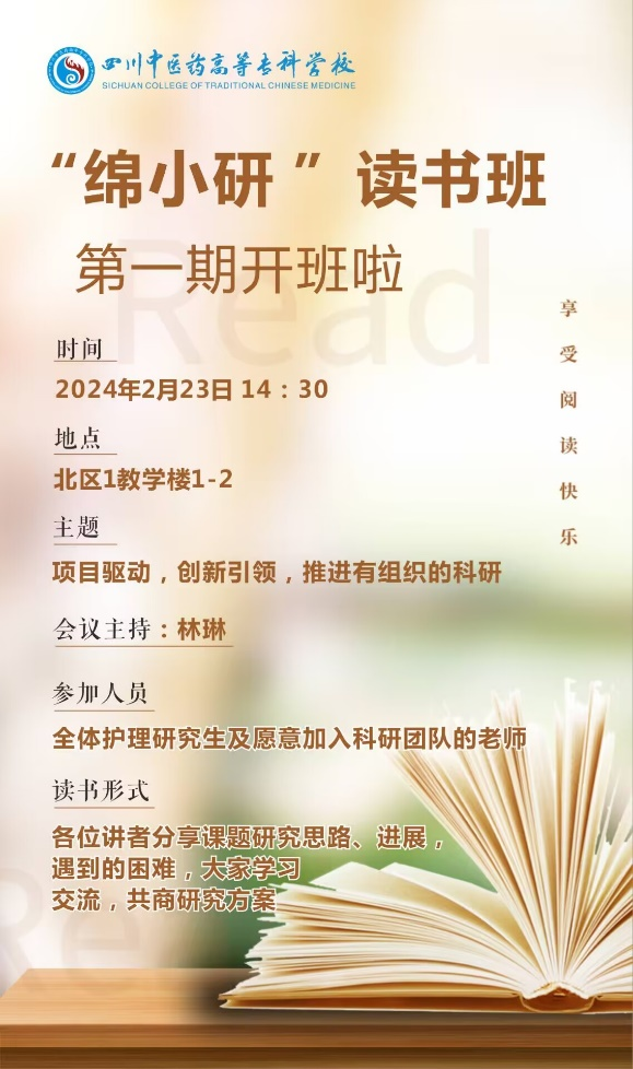 2024年2月23日14:30,备受期待的“绵小研”第一期读书班在北区102教室如期举行。此次活动吸引了护理学院所有具备研究生学历的教师,以及那些有志于加入科研团队的教师的积极参与。