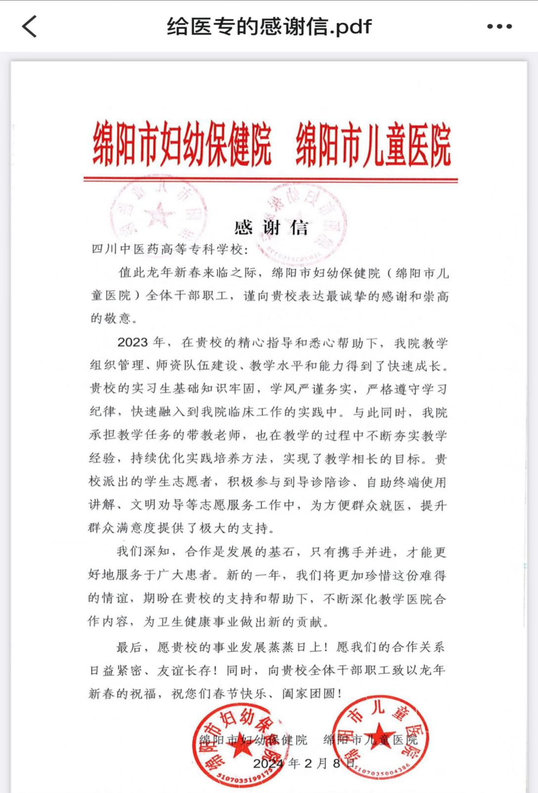 2月8日,收到来自绵阳妇幼保健医院的感谢信,信中对我校志愿者为绵阳妇幼保健医院进行导诊陪诊、文明劝导等志愿服务工作做出的贡献表示感谢。这封感谢信不仅是对志愿者的肯定,更是对四川中医药高等专科学校的赞誉。