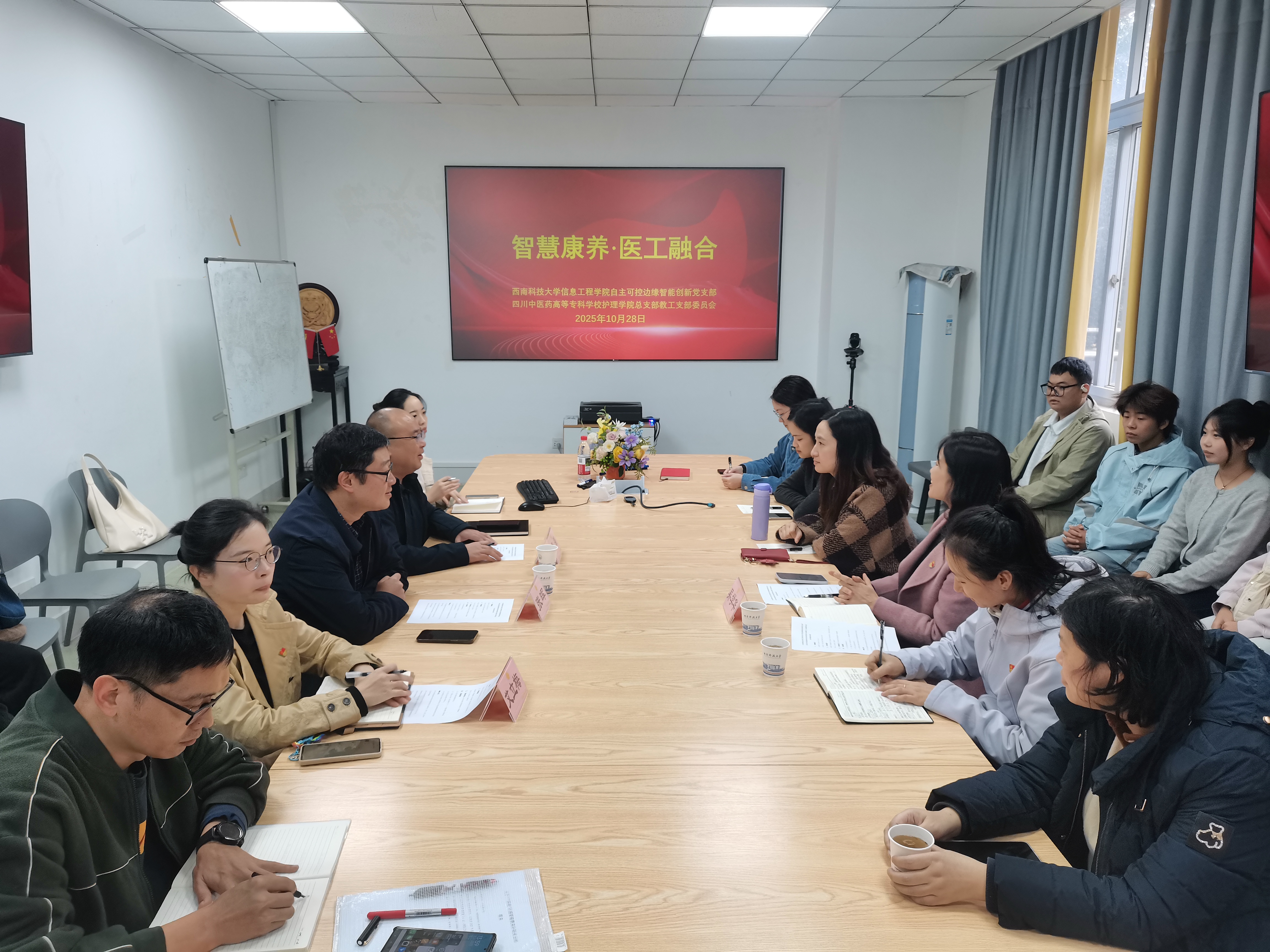 为深入贯彻落实教育部关于高校“双带头人”教师党支部书记“强国行”专项行动精神,扎实推进高校“双带头人”教师党支部书记工作室建设,10月28日下午,我校护理学院党总支教工党支部来到西南科技大学信息与控制工程学院自主可控边缘智能创新党支部开展结对共建活动。双方院领导、各支部负责人、教师党员以及学生代表共计30余人参会。