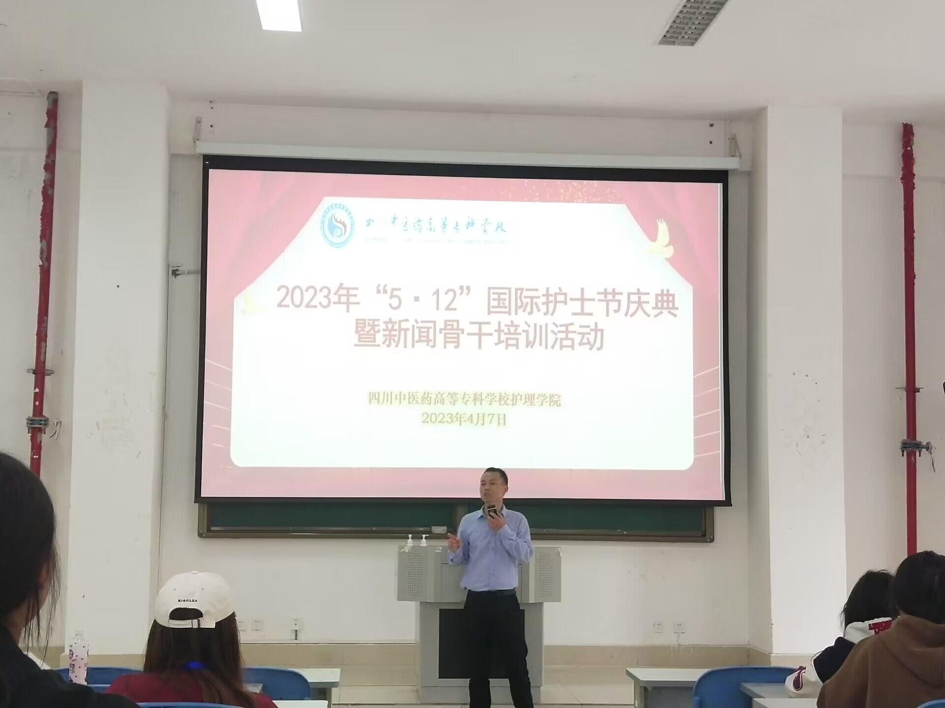 “5.12”国际护士节来临之际,我院开展相关庆祝活动,于2023年4月7日进行了学院新闻干事稿件书写培训。本次培训活动特别邀请了我校党政办邓丙金老师担任主讲人,我院党总支书记王连艳老师为此次活动做精彩开场讲话。