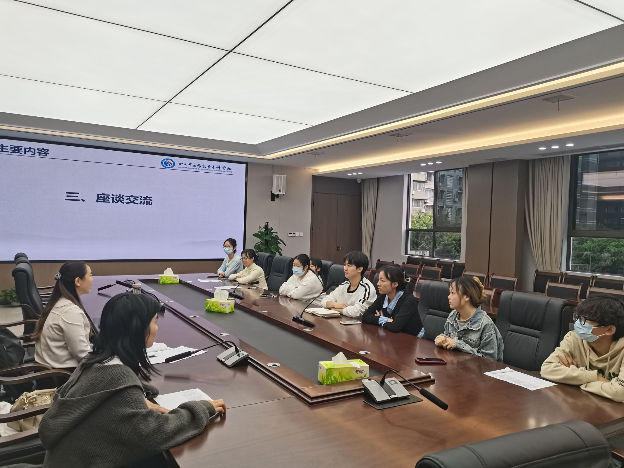 在座谈交流环节,汪晶书记主动询问了同学们的就业意向。面对领导的关心,同学们也纷纷积极发言,表达了自己对专升本、资格考试以及未来就业方向的思考和疑问。针对这些问题,汪书记和辅导员们进行了详细的解答和指导。